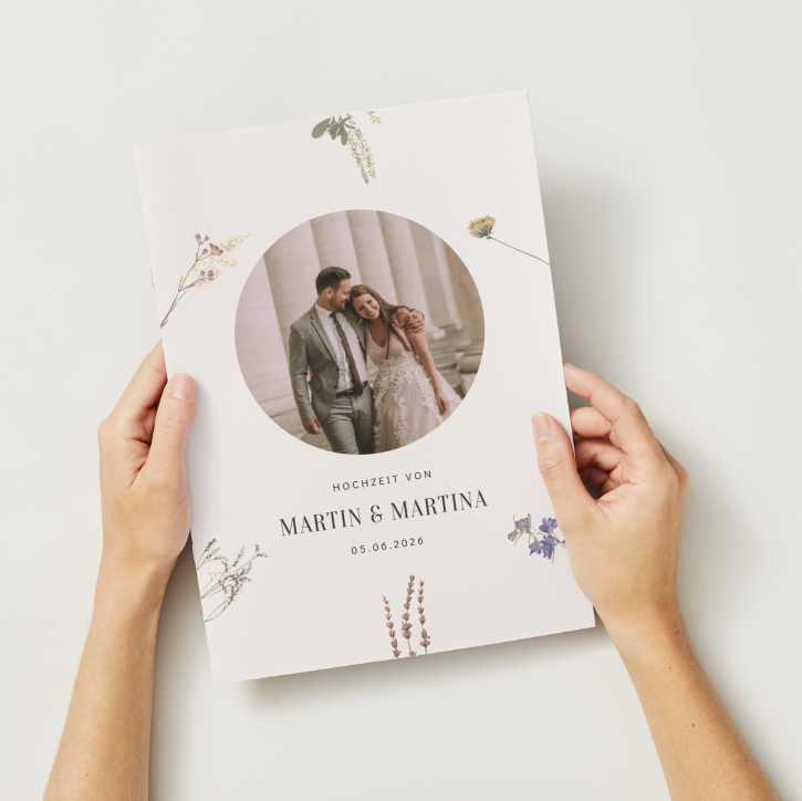 So elegant wie euer großer Tag. Die Tagesmappe liegt auf jedem Tisch und begleitet eure Gäste durch den ganzen Tag. Tagesablauf, Menü und Hochzeitsteam – alles übersichtlich in einer eleganten Faltbroschüre.