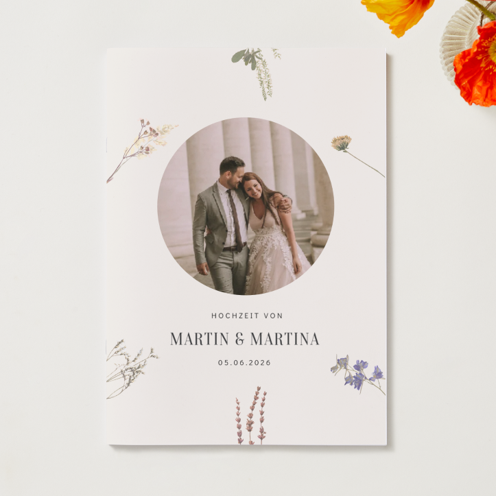 So elegant wie euer großer Tag. Die Tagesmappe liegt auf jedem Tisch und begleitet eure Gäste durch den ganzen Tag. Tagesablauf, Menü und Hochzeitsteam – alles übersichtlich in einer eleganten Faltbroschüre.